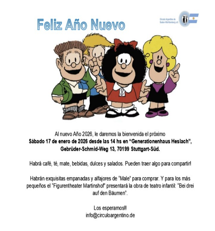 Para el 2026 vamos a seguir trabajando para que nuestros encuentros sean vivencias acogedoras y divertidas. Trataremos de ofrecerles eventos para grandes y chicos, con actividades llenas de música, danzas folclóricas y delicias tradicionales. Y por supuesto, nos ocuparemos de brindarles un „ratito argentino“ y así revivir en esos instantes, nuestra añorada Argentina.